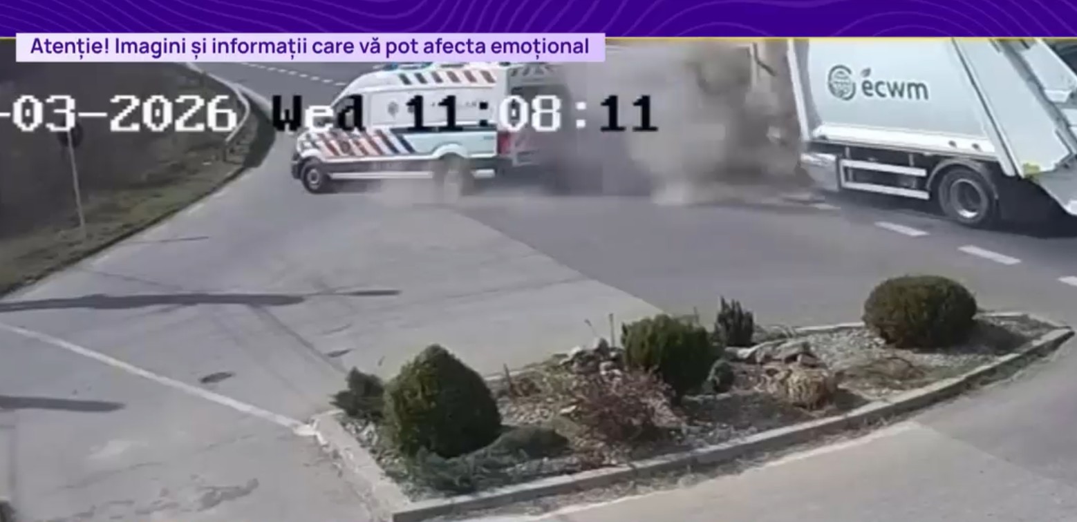 Victima unui accident rutier, rănită din nou după ce ambulanţa s-a ciocnit cu un camion de salubritate, pe DN 7 Momentul impactului