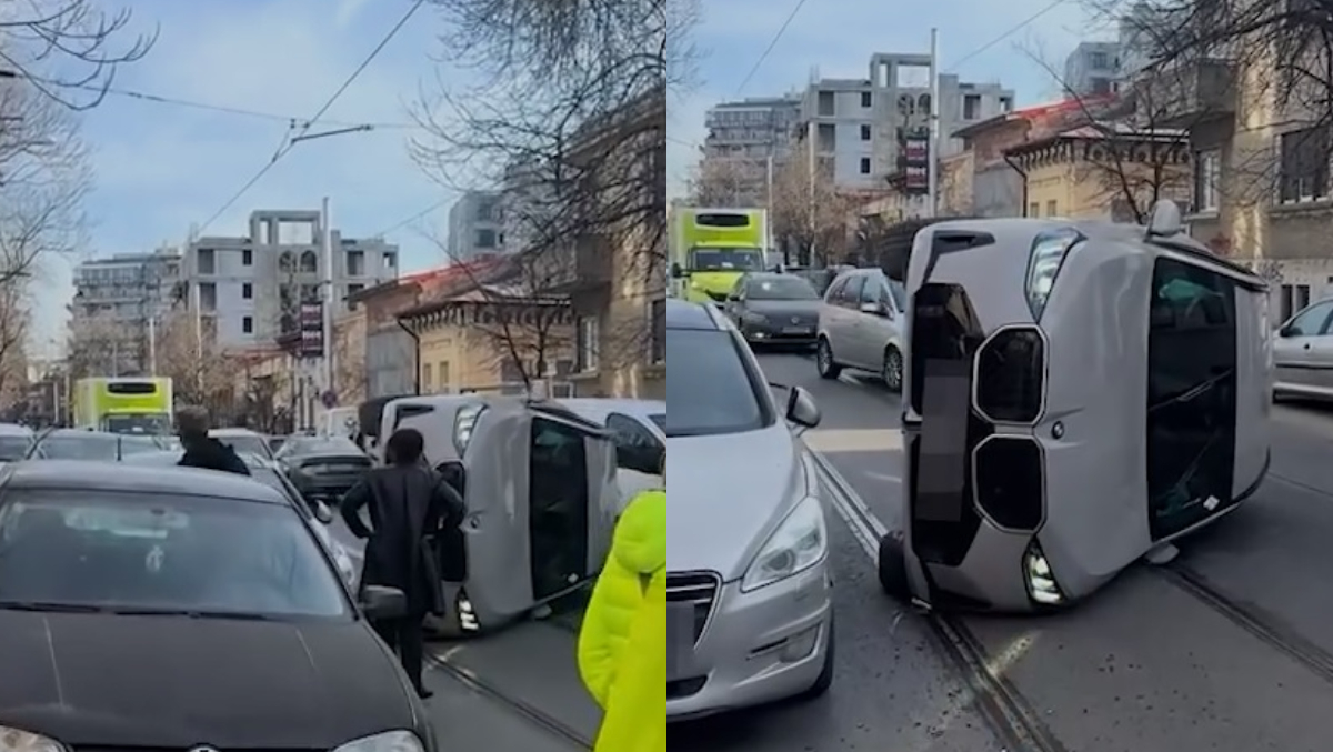 Accident rutier în sectorul 2 din București! O mașină s-a răsturnat chiar pe linia de tramvai