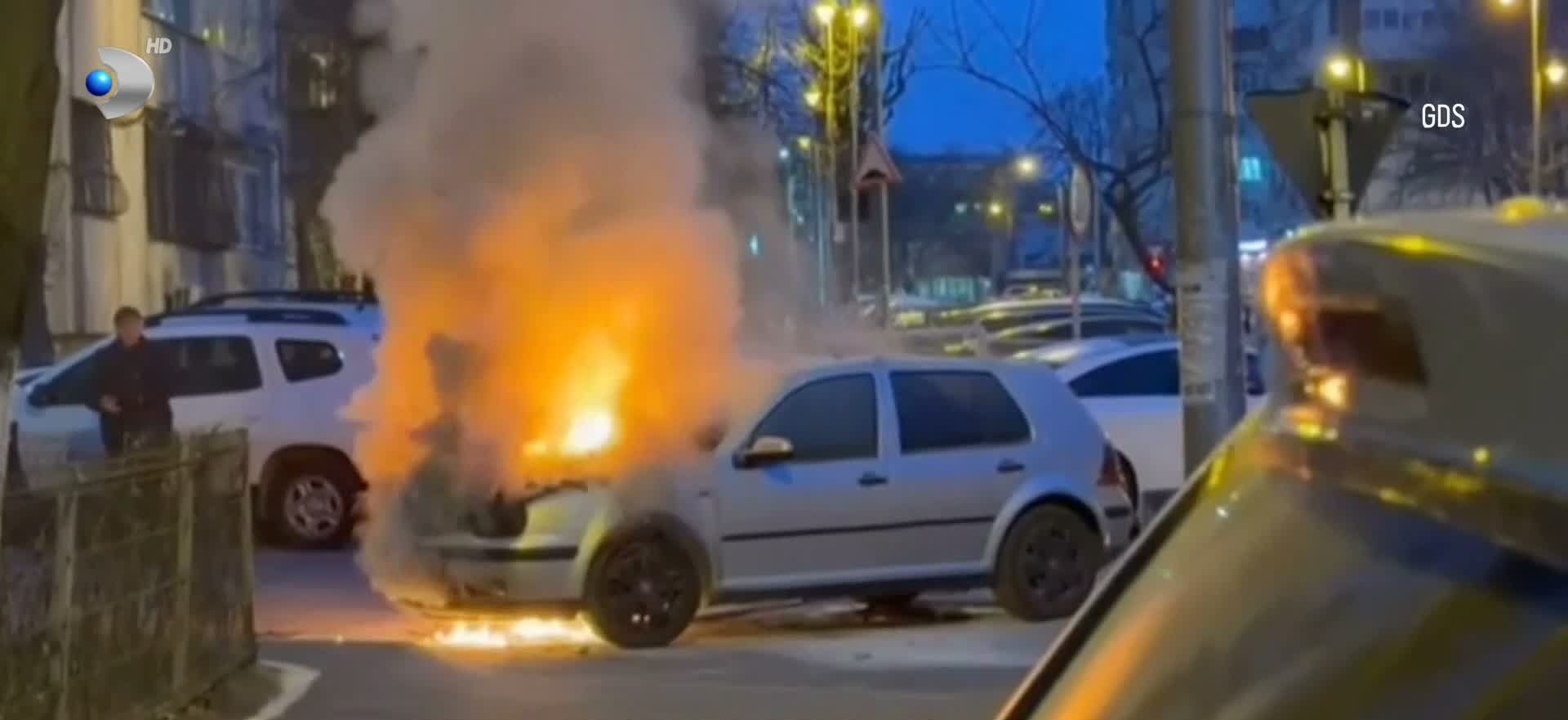 Momentul în care o maşină este cuprinsă de flăcări pe o stradă din Galaţi Şoferul a reuşit să iasă la timp