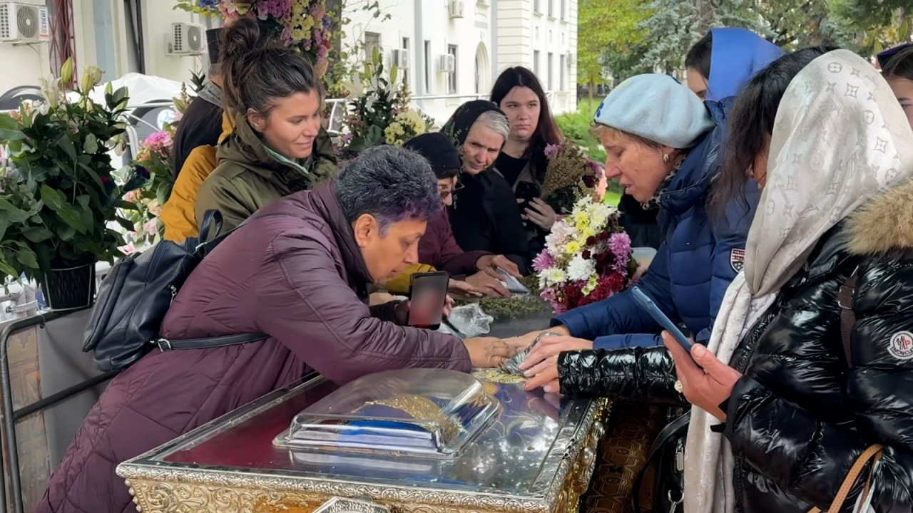 O femeie a "sărutat" moaştele Sf Parascheva şi s-a rugat prin video call, ajutată de o pelerină