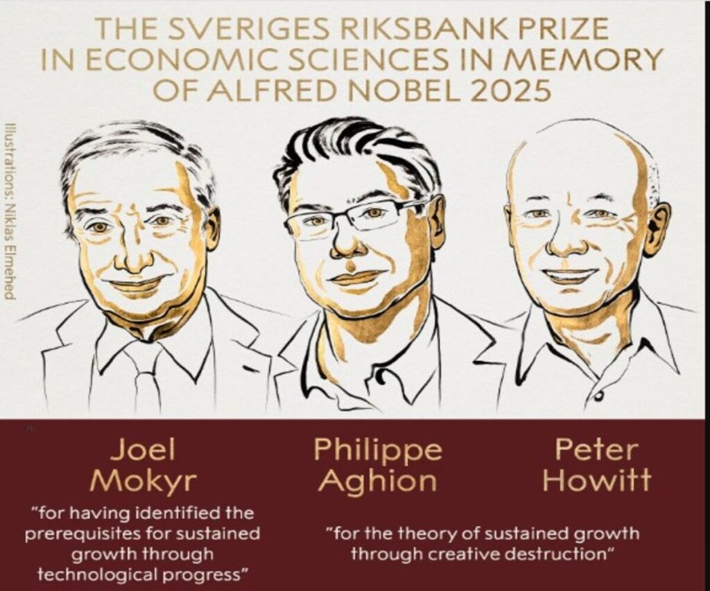 Premiul Nobel pentru economie a fost câștigat în 2025 de Joel Mokyr, Philippe Aghion și Peter Howitt pentru explicarea legăturii dintre creșterea economică și inovație